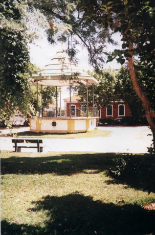 Coreto de Benavente, situado no interior do Parque 25 de Abril. Ao fundo, no exterior do espaço, é possível visualizar parte da moradia que pertenceu ao Dr. Francisco de Sousa Dias. Tirada no ano 2000. (ver Bloco de Notas)