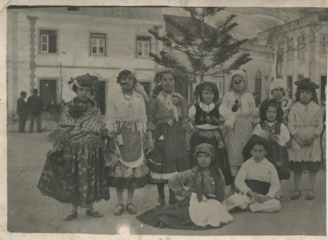 Retrato de um grupo de crianças mascaradas no Jardim da Praça da República, em Benavente. O rapaz, sentado no chão é o Fernando José e entre as raparigas estão identificadas a Ivone, a Celeste e a Maria Georgina. Ao fundo, à direita é possível visualizar o prédio numa das extremas da Rua do Paço, com a fachada para a Rua João Sabino de Almeida Fernandes. Tirado no Carnaval de 1933.